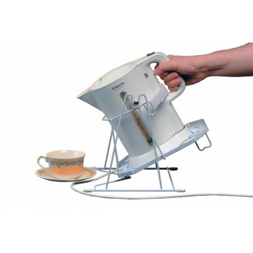 This innovative kettle tipper will suit most cordless kettles. There is a metal plate that secures the base of the cordless kettle and a frame with a hook and loop strap to keep the upper part of the kettle in place. A cut out at the foot of the tipper allows cups to be positioned as close to the kettle as required. The frame has a built in back stop to prevent spillage if the kettle is accidentally released during use.
